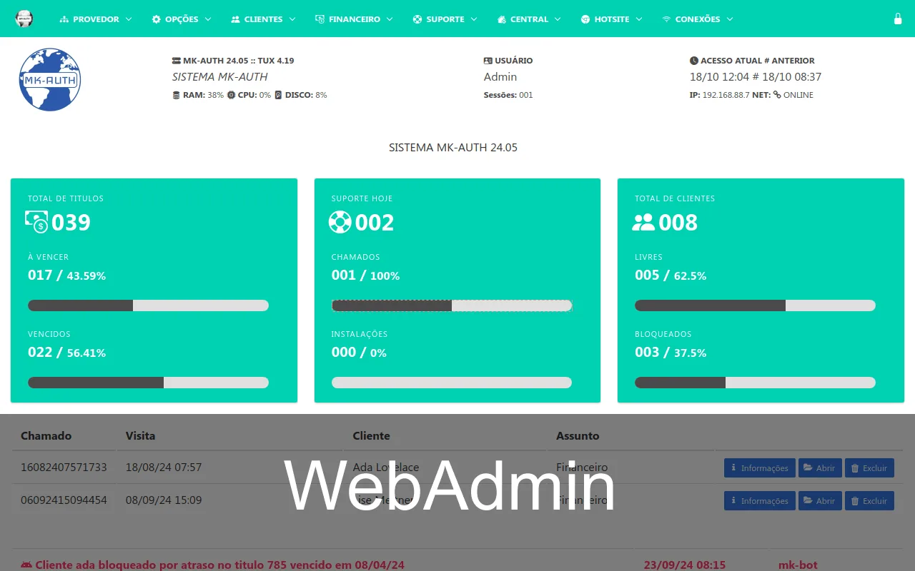 O MK-AUTH é uma distro Linux pronta para ISPs com RADIUS, Banco de Dados, Servidor Web, Docker, SSH e Cloudflare Tunnel já integrados. Painel 100% web para autenticação, cobrança e suporte.